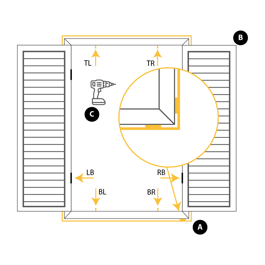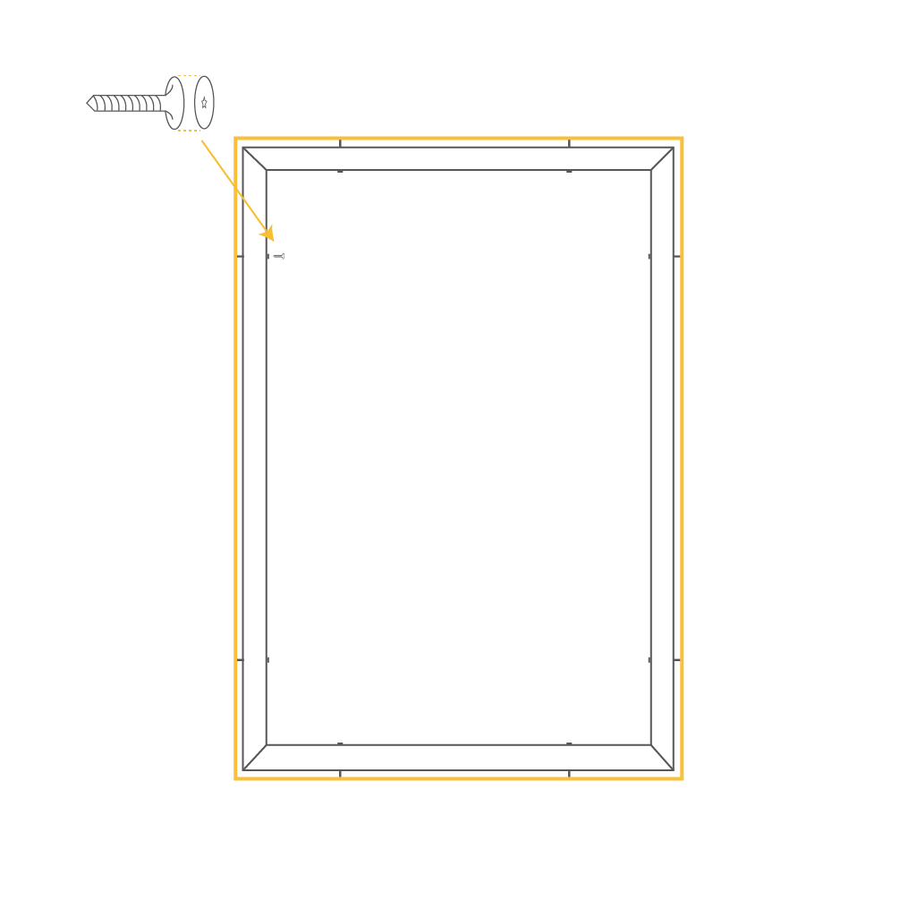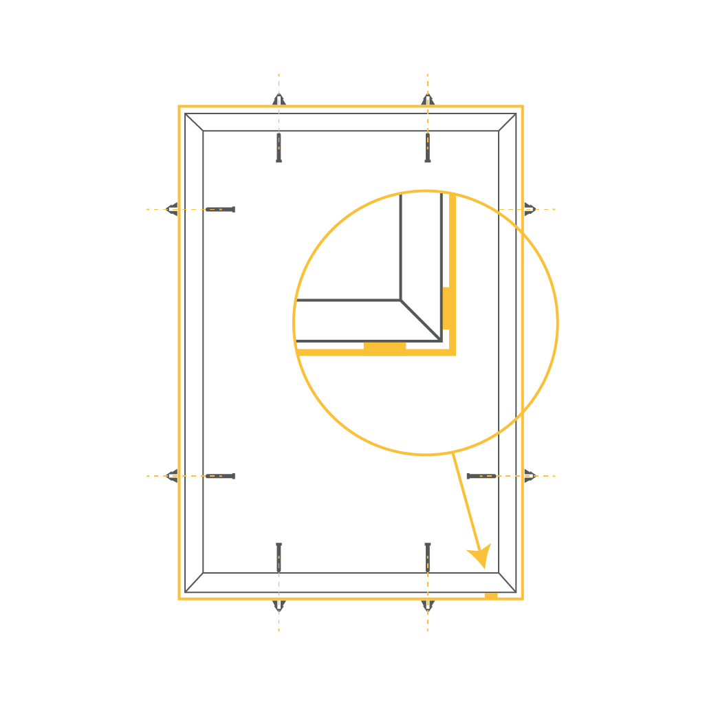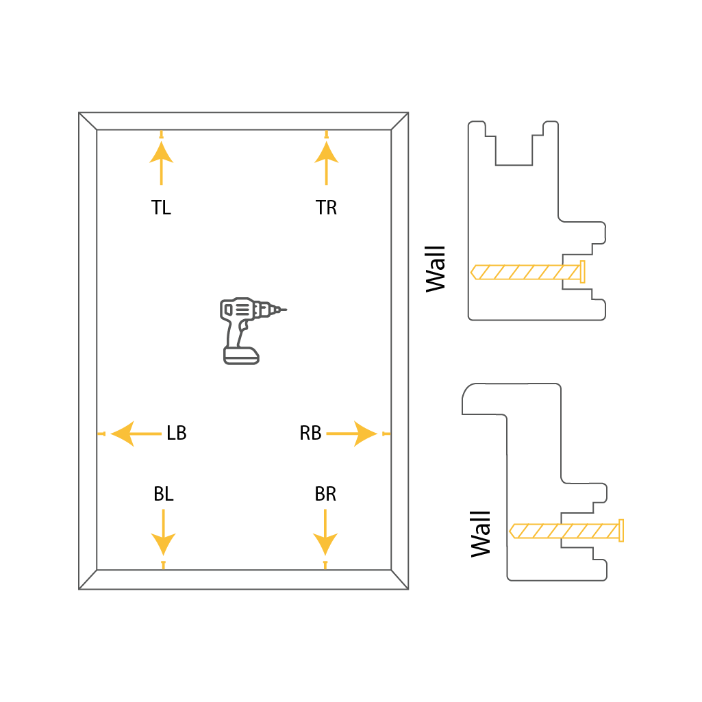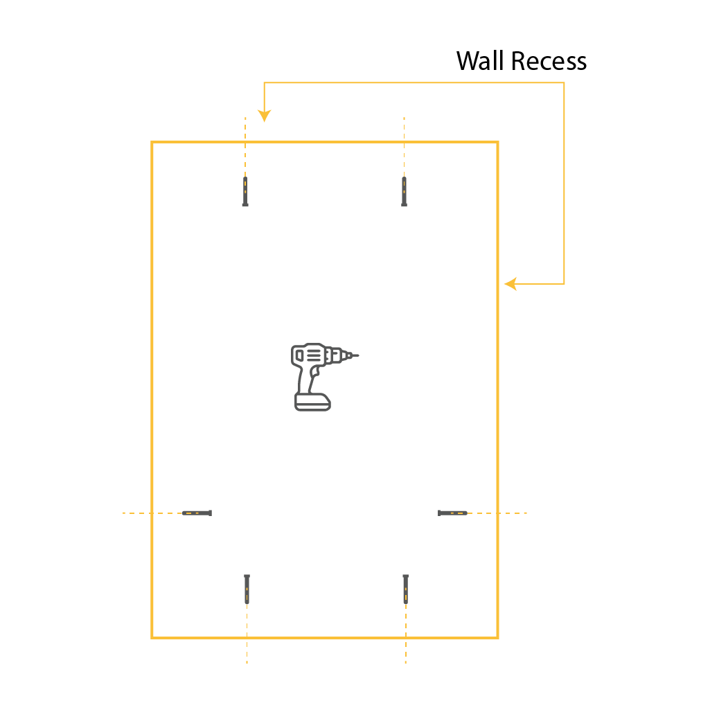 With the frame positioned within the recess, start with Left Top and Right Top screws. Make the mark by screwing the screws partially into the wall, when done, unscrew them.